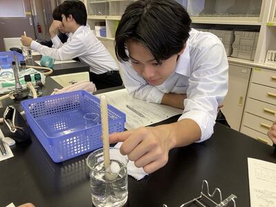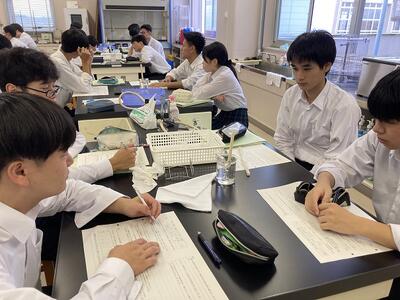 電気電子科3年で「科学と人間生活」の授業風景を撮影しました。授業では、アルコール発酵で温度と気体の体積の関係を求める実験を行いました。グルコース溶液とドライイーストを混合し、二酸化炭素の体積をスプレッドシートに入力し、クラスでデータを共有・分析します。