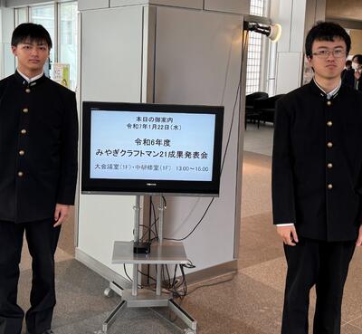 令和7年1月22日(水)宮城県産業技術総合センター大会議室で「令和7年度みやぎけんクラフトマン21事業成果報告会」が開催され、電気電子科1年生2名が「実践で学ぶ!電気工事士への道」と題して講習会の報告を行いました。