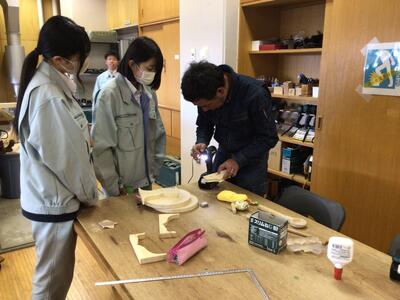 令和6年12月19日(木) 建築科の課題研究の時間です。課題研究も佳境に入り、慌ただしくなってきました。建築工房班は花を置く台やボールを入れる籠の制作中。造形制作班と自由設計班は1月23日の発表に向けて資料制作に取り組んでいます。さすが3年生です。忙しさの中にも笑顔があります。発表が楽しみです!