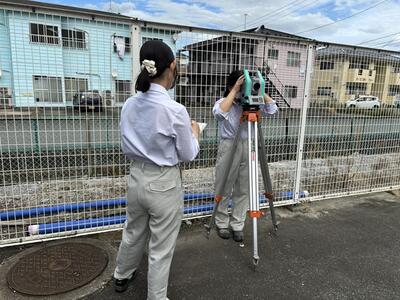 令和6年9月19日(木)5~6時間目、土木情報科1年生の土木情報実習の様子です。8班に分かれ、校舎や体育館の周りをトータルステーションを使って計測するトラバース測量を行いました。各班協力して計測を行いましたが、正確さはまだまだ…のようです。これからたくさん練習して、正確な測量をできるように頑張ります!