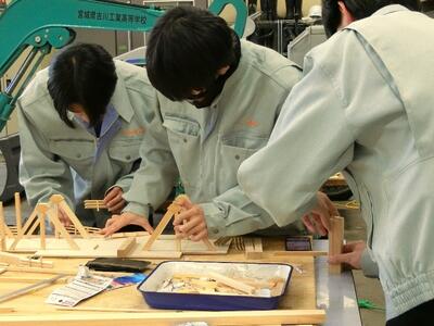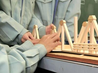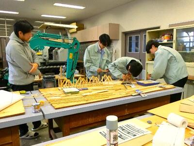 令和6年12月19日(木) 放課後の時間を使って、土木情報科3年生の課題研究「橋梁模型班」の生徒が年末の追い込みを行っています!橋梁模型班は2班あり、1つの班はすでに完成しています(写真下2つの赤い橋)。今作業している班も、担当の先生の監督のもと、3人で協力して真剣に組み立てを行っています。どんな橋が完成するのか楽しみです!