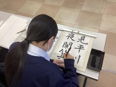 桜舞い散り、青葉繁るころ。書道を志す者まず習う、王羲之の「蘭亭序」を臨書しているところです。1年生は半紙練習、2,3年生は半切で練習しています。手本をよく観て字形をとらえる、バランスをとる、といったことを学びます。当時、王羲之が酒をのみ、調子づいて一気に書き上げた作品を、私達は時間をかけてじっくり学んでいます。