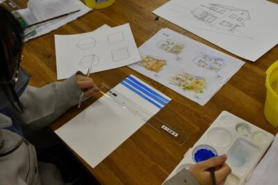 令和6年12月11日(木)~12日(金)建築科1年生を対象にパース着色講座を実施しました。外部より講師の先生をお招きし、2日間にわたり住宅パースの着色を行いました。線の練習から始まり、窓の着彩、壁の着彩、外構の着彩の順で進んでいきます。普段とは違う透明水彩の絵の具を使うことに、はじめは苦戦していましたが、全員個性のある住宅パースを完成させることができました。今後の学習にもいかしてもらいたいですね。