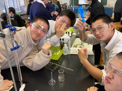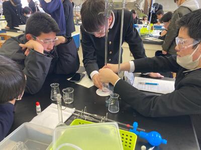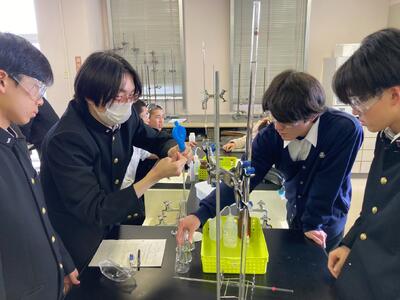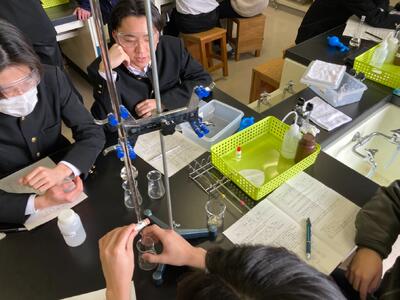 令和7年1月29日(水)化学基礎の授業で、中和滴定実験を行いました。10倍に希釈した食酢を、濃度既知の水酸化ナトリウム水溶液で滴定し、食酢に含まれる酢酸の濃度を求めます。初めて使うガラス器具に最初は四苦八苦しましたが、だんだんとスムーズに操作ができるようになりました。淡いピンク色になったら滴定終了。次の授業では実験データを分析し、自分たちの実験の振り返りを行います。