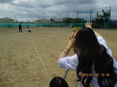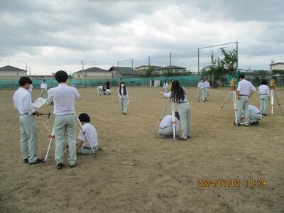 令和6年7月2日(火)土木情報科3年生の土木情報実習「単心曲線設置班」の様子です。道路のカーブを設置するための測量実習を行いました。あいにくの曇り空でしたが、生徒たちは班ごとに協力して真剣に測量を行っていました。