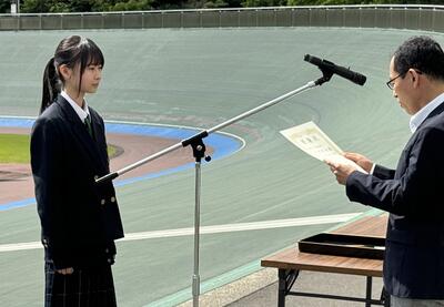 令和6年5月25日(土)大和町の宮城県自転車競技場で行われた自転車競技部の県総体表彰式で、本校美術部の千葉琥珀さん(建築科3年)が感謝状を授与されました。宮城県自転車競技専門部の広報活動として、千葉さんがデザインしたPRポスターが高く評価され、このたび授与されることになりました。