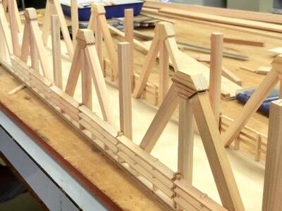 令和6年12月19日(木) 放課後の時間を使って、土木情報科3年生の課題研究「橋梁模型班」の生徒が年末の追い込みを行っています!橋梁模型班は2班あり、1つの班はすでに完成しています(写真下2つの赤い橋)。今作業している班も、担当の先生の監督のもと、3人で協力して真剣に組み立てを行っています。どんな橋が完成するのか楽しみです!