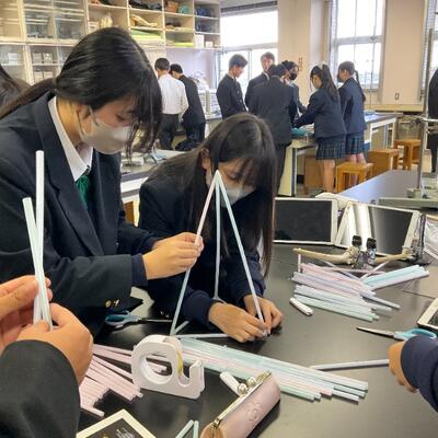 建築構造設計の授業では、安定した建築物を設計するための構造や理論を学んできました。今回の授業ではその知識を応用し、100本のストローを使ってどれだけ高いタワーを作れるかに挑戦しました!ストローという軽い素材で建築物のような安定感を出すのは難しいですが、これまで授業で学んだ三角形の構造や荷重分散の工夫などの技法が各所に取り入れられていました。