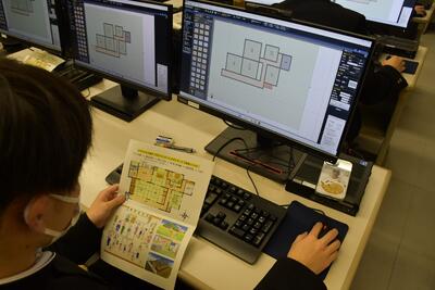 令和6年12月12日(木)~13日(金)建築科1年生を対象に3Dマイホームデザイナー講座を実施しました。このソフトは、平面図を入力することで、住宅などの建築物を立体的に起こしてくれるものです。住宅の提案やシミュレーションにとても適しています。今回は、「サザエの家を3Dマイホームデザイナーで再現してみる」という課題で行いました。使い方を覚えるとスムーズに作業を進めていました。最近はじまった、製図の自由設計の課題にもシミュレーションで使用できます。とても楽しく学習することができました。