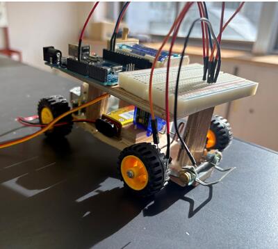 ▼ 自動走行するロボットです。プログラミングの基礎を学ぶ教材用として組み立てました。