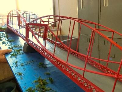 令和6年12月19日(木) 放課後の時間を使って、土木情報科3年生の課題研究「橋梁模型班」の生徒が年末の追い込みを行っています!橋梁模型班は2班あり、1つの班はすでに完成しています(写真下2つの赤い橋)。今作業している班も、担当の先生の監督のもと、3人で協力して真剣に組み立てを行っています。どんな橋が完成するのか楽しみです!