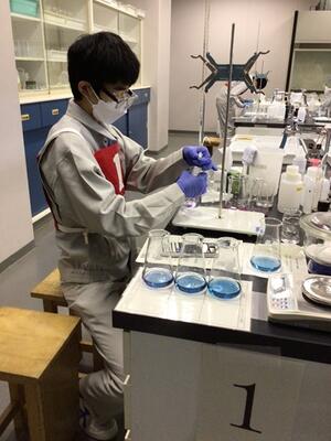 令和6年7月9日(火)化学技術科3年生の総合実習の様子です。実習では、DNA電気泳動を用いて米の品種判別を行いました。無菌室で準備したアガロースゲルを、暗室に運んで反応しているかを観察しました。準備に時間がかかりましたが、無事に反応したようで実験成功のようでした。