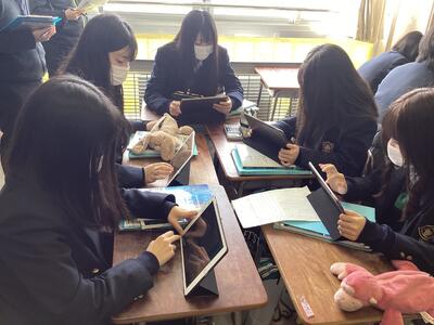グループワークを中心に、測定値からph指示薬の色の変化を考え、それぞれのグループの情報をipadで共有し、クラス全体で協力しながら学びを深めました。多くの先生方に見守られ、緊張しているのかと思いましたが、生徒たちは積極的に意見交換しながら授業を楽しんでいるようでした。