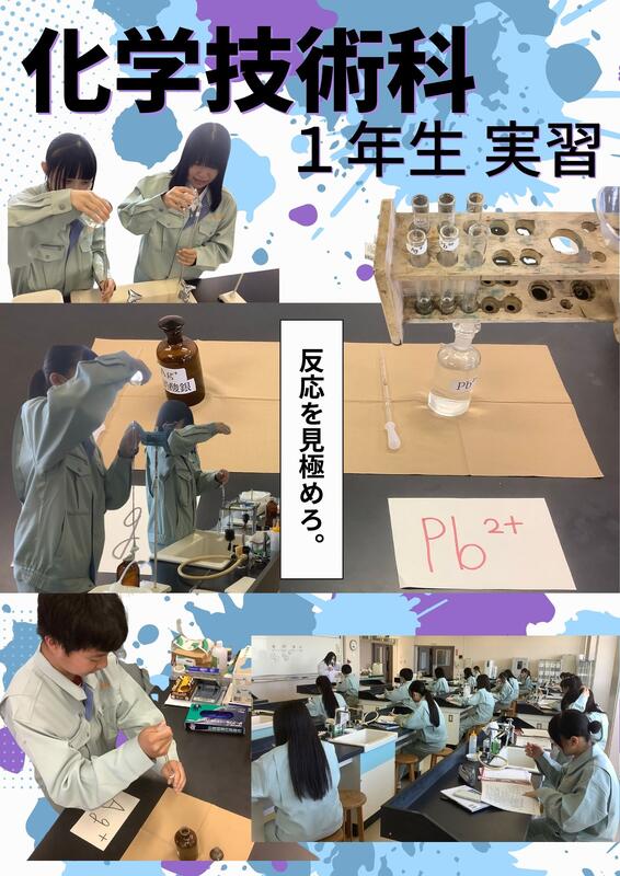 令和7年5月19日(月)3・4校時の、化学技術実習の授業風景です。2つの班に分かれて、水溶液の中にどのような物質・量が溶けているか調べる実験を行いました。各班で様々な反応が起きたようでした。充実した楽しい実習となったようです。
