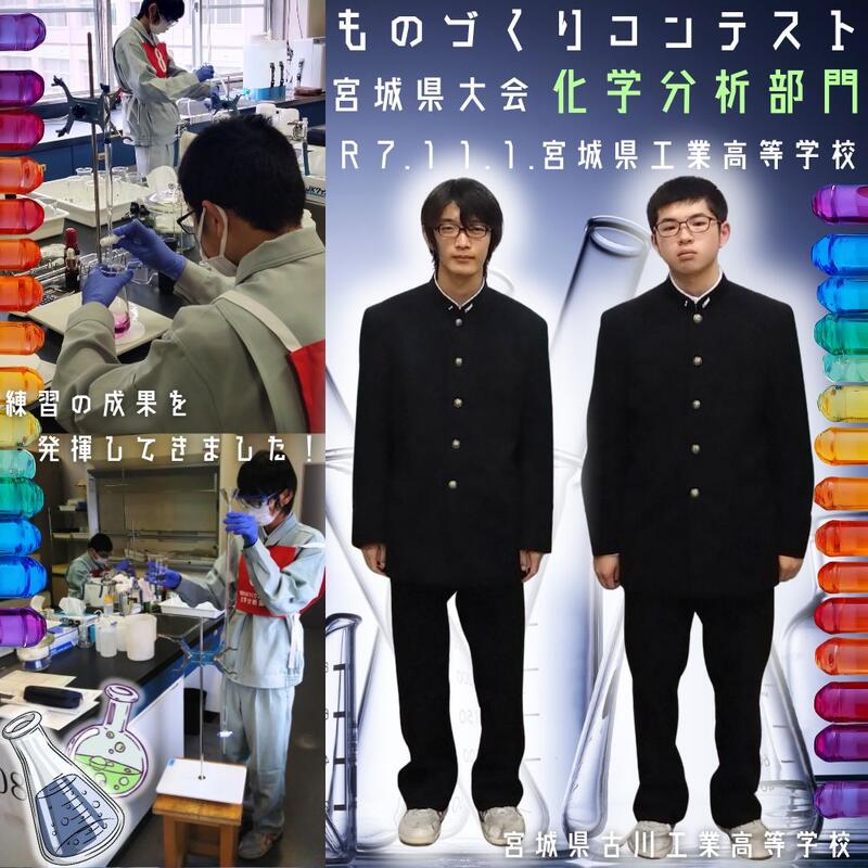 令和6年11月2日(土)高校生ものづくりコンテスト宮城県大会「化学分析部門」が、宮城県工業高等学校で行われ、本校からは2名の選手が出場しました。結果は化学技術科2年の沼倉 悠乃が第6位、化学技術科1年の酒井 想真が第3位に入賞しました!応援ありがとうございました!