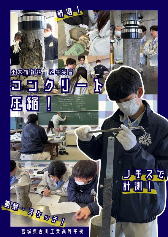 令和8年1月20日(火) 土木情報科2年の土木情報実習にて、コンクリートの圧縮試験を行いました。昨年の実習で作成した供試体の表面を研磨機で削り、寸法や重さを測定した後、万能試験機で圧縮しました。生徒は自分たちで作ったコンクリートが強度の基準を満たしているか、興味津々でした!