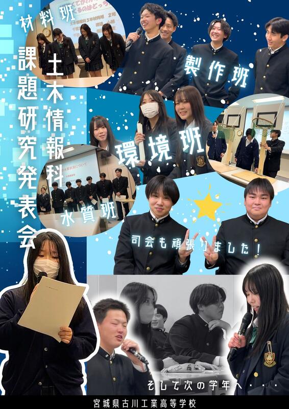 令和8年1月27日(火) 土木情報科3年生の課題研究発表会を行いました。材料班(環境班)、製作班、水質班に分かれて1年間課題研究の授業で研究したことを発表しましたが、各班スライドや成果物に個性が光っていて、とても盛り上がりました!2年生にも聞いてもらい、たくさん質問もしてもらいました。この発表を聞いて、次年度の課題研究では、どんな研究をするのでしょうか。楽しみですね!