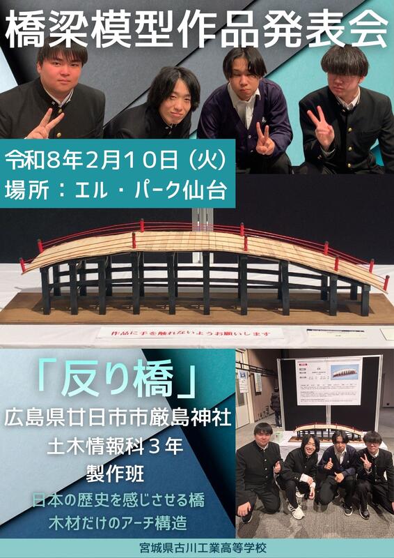令和8年2月10日(木) エル・パーク仙台にて行われた第24回(令和7年度)高校生「橋梁模型」作品発表会にて、土木情報科の3年生4名が課題研究で製作した橋梁模型「反り橋」の発表を行いました。広島県の厳島神社に実在するこの橋を選んだ理由は、日本の歴史を感じさせる橋、木材だけで成り立っているアーチ式構造に魅力を感じ、挑戦したいと思ったからです。残念ながら上位入賞は逃してしまいましたが、審査員の前で堂々と発表することができました。