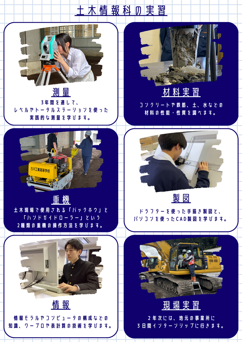 令和6年10月16日(水)~18日(金)までの3日間、土木情報科2年生が現場実習を行いました。地元大崎の企業を中心に、10の事業所にご協力をいただきました。生徒たちは、実際の現場で測量を行ったり、重機を操作させていただいたり、ダムの内部を見学するなど、普段の学習や実習が土木の現場でどのように生かされているかを体感することができました。また、デジタル技術を活用した工事やドローンなど、最新技術にも触れる貴重な機会となりました。ご協力いただいた事業所の皆様には、大変貴重な経験をさせていただき、心より感謝申し上げます。