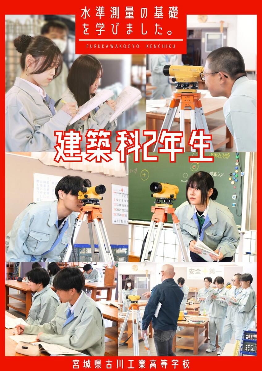 令和8年4月20(月)建築家2年生が実習で水準測量の基礎を学びました。据え付けの際の水平の取り方など、先生の話を聞きながらメモを取り、理解しようとする姿は工業高校生らしくなってきたなと感じます。
