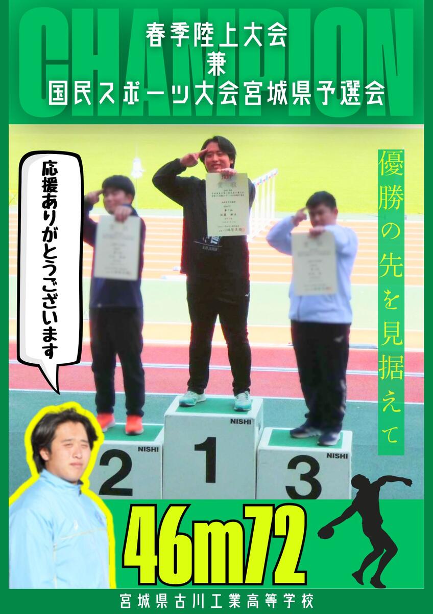 4/18(土)~4/19(日)まで春季陸上大会兼国民スポーツ大会宮城県予選会が宮城スタジアムで行われました。男子円盤投で佐藤瑛亮(E2)が46m72を投げて優勝しました。応援有り難うございました。