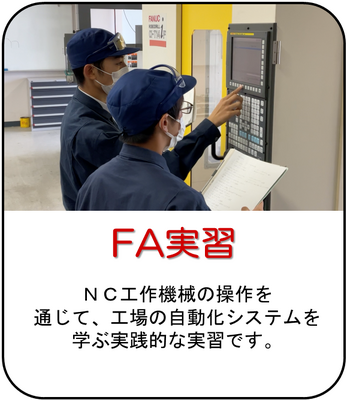 これは、3年生のFA実習の様子です。最初に渡される型に当てはまるような型を作ります。型の大きさを計測、そしてパソコンで図面を作成し、その図面をデータ化し、マシニングセンタという機械にそのデータを送ることによって型を作っていきます。実際に上手に当てはまる型が完成したときはとても嬉しそうでした。