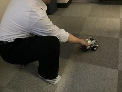 ▼ プログラムをコンピュータに入力しています。今回の課題は、「直進 → 右へ90度方向転換」を繰り返し、1周するプログラムです。