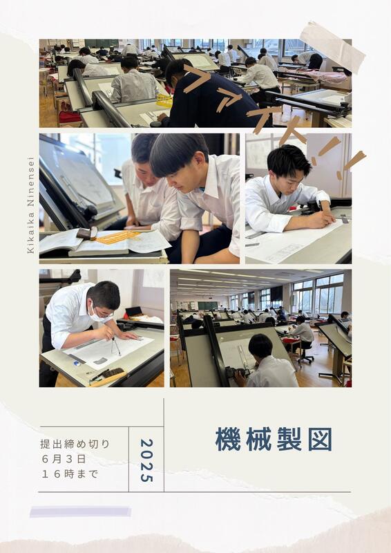 令和7年6月3日(火)機械科2年生の製図の授業の様子です。みんなで教え合いながら製図に取り組んでいました。今日は製図の提出締め切り日だったので、いつも以上に気合いを入れて取り組んでました!