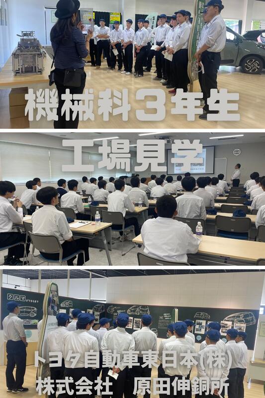 令和7年6月27日(金)、機械科の3年生で工場見学に行きました。トヨタ自動車東日本(株)さんと株式会社原田伸銅所さんの2社を見学しました。7月1日に始まる進路活動に向けて、自分がやりたいことを再確認できるとてもよい体験になったと思います。