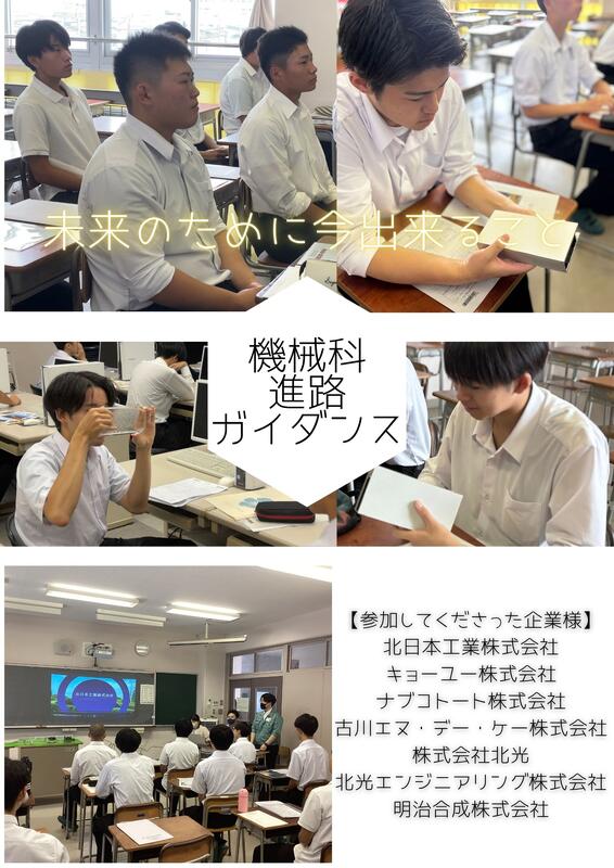 令和7年7月16日(水)、機械科2年生で進路ガイダンスを行いました。多くの企業の方に来ていただいて、会社の説明を真面目に聞いている姿や会社で作っている製品をとても興味深く眺めたり触っている姿が見られました。今回参加していただいた北日本工業株式会社様、キョーユー株式会社様、ナブコトート株式会社様、古川エヌ・デー・ケー株式会社様、株式会社北光様、北光エンジニアリング株式会社様、明治合成株式会社様、誠にありがとうございました。
