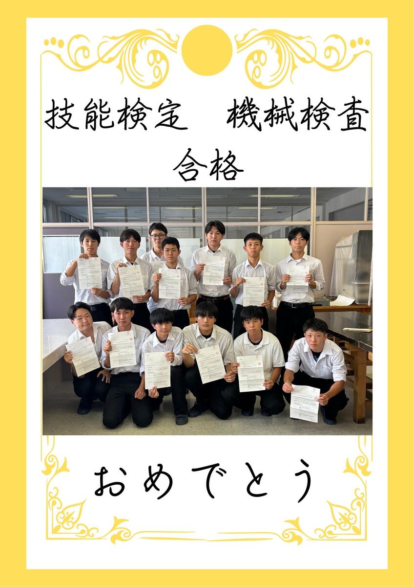 令和6年度前期技能検定試験の合格発表が行われ、機械検査3級に3年生8名、2年生1名が合格しました!おめでとうございます!