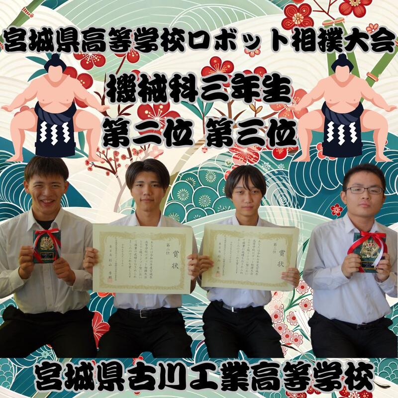 課題研究のロボット班が、令和7年9月27日(土)に開催された「令和7年度宮城県高等学校ロボット相撲大会」に出場いたしました。研究の成果が実り、見事、第2位、第3位に入賞しました。たくさんのご支援と応援ありがとうございました。