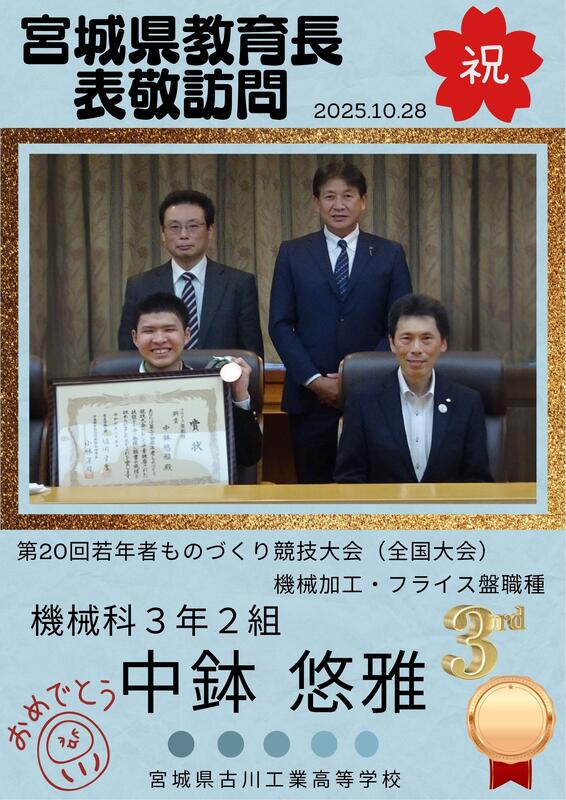 今年度7月に開催された第20回若年者ものづくり競技大会(全国大会)において、機械科3年 中鉢 悠雅 君が、機械加工・フライス盤職種で銅賞に入賞しました。宮城県教育長を表敬訪問して、大会での活躍を報告してきました。