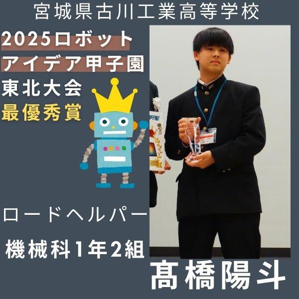 令和7年11月8日(土)、ロボットアイデア甲子園東北大会が開催されました。東北ブロックから29校エントリーがあり、総勢458名の学生の中から本校からは機械科1年2組の髙橋陽斗君が選考で選ばれ、最優秀賞を獲得しました。12月に行われる全国大会に向けてこれからも頑張っていきます!