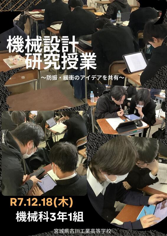 令和7年12月18日(木)4校時に、機械科3年1組で機械設計の研究授業がありました。「共振」についての知識を確認した上で、防振と緩衝のアイデアを生徒どうしで話し合いながら理解を深めることができました。