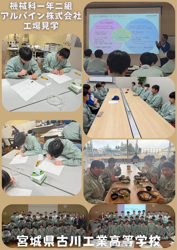 令和7年12月9日(火)、16日(火)に機械科1年生がアルプスアルパイン株式会社古川第二工場に工場見学に行きました。鏡面磨き体験を行い、生徒同士で競い合いながら、上位三名には豪華な景品まで用意していただきました。そして、本校OBの先輩方との座談会を通して、自分たちが将来ためにどのようなことを目標に努力すればいいのか考えることができました。このような機会を設けてくださったアルプスアルパイン株式会社様、誠にありがとうございました。