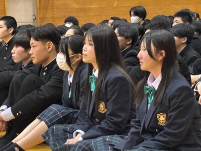 令和7年4月9日(水) 全学年の生徒が体育館に集まって対面式を行いました。1年生は吹奏楽の演奏が流れる中、緊張した面持ちで入場しました。生徒会長から「私たちとともに切磋琢磨し、初めにたてた目標を達成できるよう、実りのある高校生活を送っていきましょう」という歓迎の挨拶がありました。