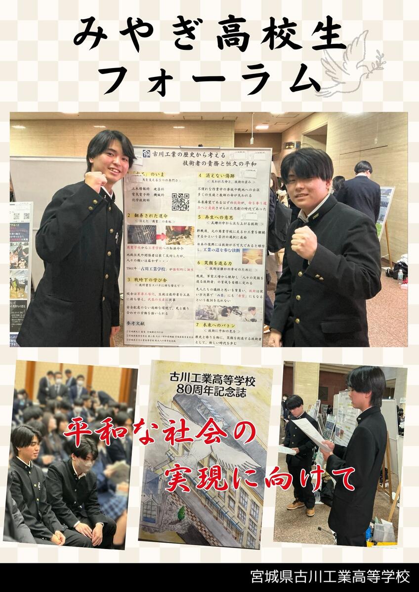 令和8年1月24日(土)県庁で開催された「みやぎ高校生フォーラム」に、生徒会役員2名が参加しました。今年度は戦後80年という節目の年にあたることから、「平和な社会の実現に向けて、私たちができること」をテーマに、県内の高校生によるポスターセッションが行われました。