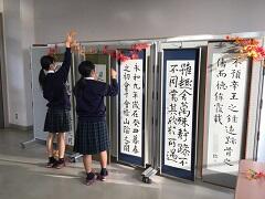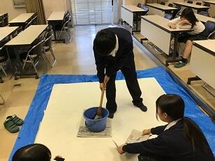 普段は賑やかな部員も、半紙や半切に文字を書くときだけは、しんと静まりかえり、邪念をいっさい捨て、各々の作品に集中します。展覧会や文化祭への出品が間近に迫ると、自主練習を重ね、自分が納得のできる作品を仕上げていきます。