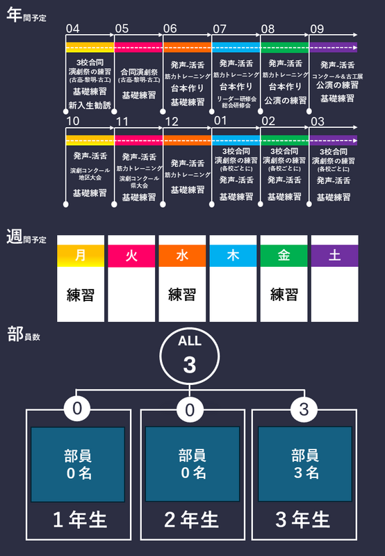 | 演劇部は、演劇が好きというよりは、「目立ちたい」「自分を自由に表現したい」など、現実よりも空想にひたることが好きなメンバーが集まっています。自分たちが創造した世界を脚本を通して演じていく。それを見た観客を同じ世界に引き込んでいく。そんな夢のある活動をしています。 |